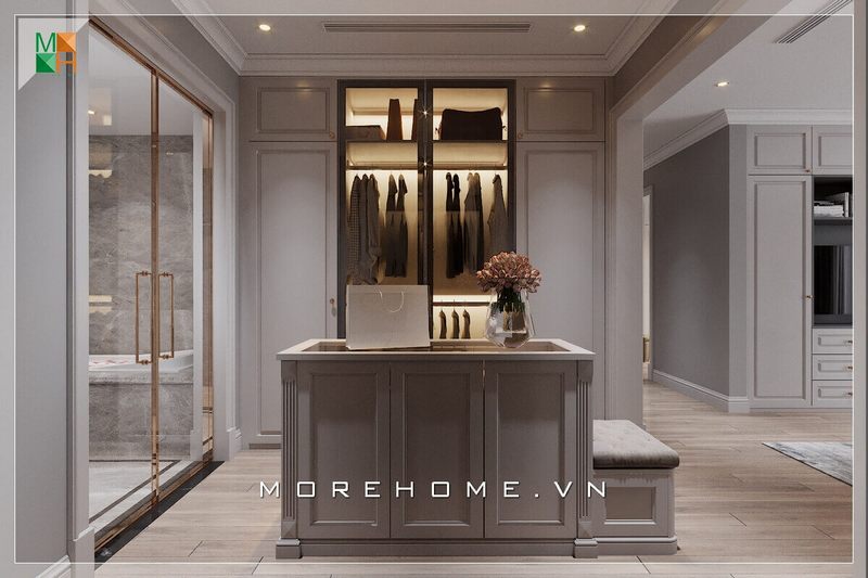 Để giúp không gian phòng để đồ biệt thự, nhà phố trở nên tiện nghi và lạ mắt hơn, thiết kế nội thất Morehome đã sáng tạo thêm đảo phụ kiện tân cổ điển đặt giữa căn phòng khá tiện ích và đẹp mắt.