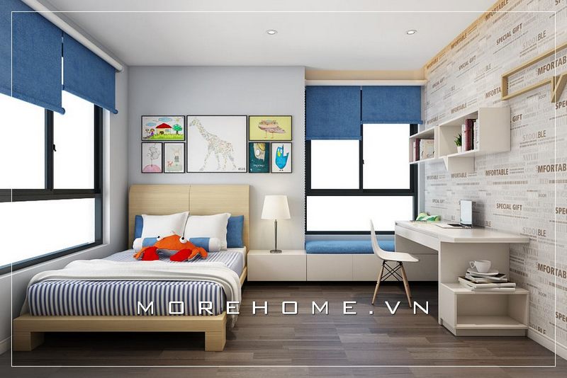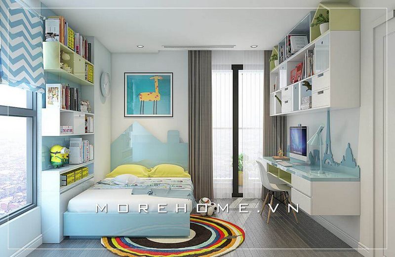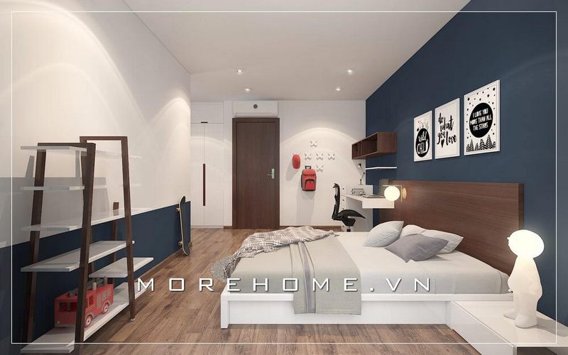 Bố trí nội thất phòng ngủ bé trai khoa học, hợp lí, từ chiếc giường ngủ hiện đại gỗ công nghiệp cho tới bàn học, kệ sách... tạo cho con một không gian nghỉ ngơi, học tập thoải mái nhất