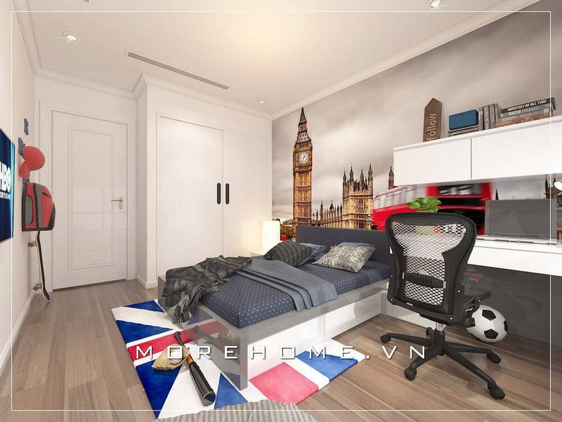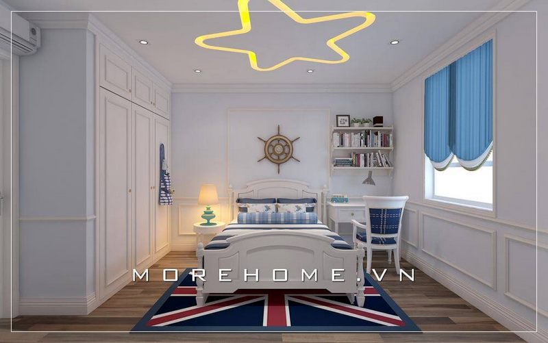 Thiết kế phòng ngủ bé trai ấn tượng, sự kết hợp hài hòa giữa giường ngủ tân cổ điển, bàn, ghế, đồ decor trang trí mang lại không gian độc đáo và cá tính hơn cả