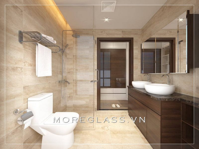 Phòng tắm hiện đại được thiết kế với những kệ tủ trang trí, tủ lavabo đơn giản nhưng hiện đại, cùng với các thiết bị vệ sinh và phòng tắm kính đẹp.
