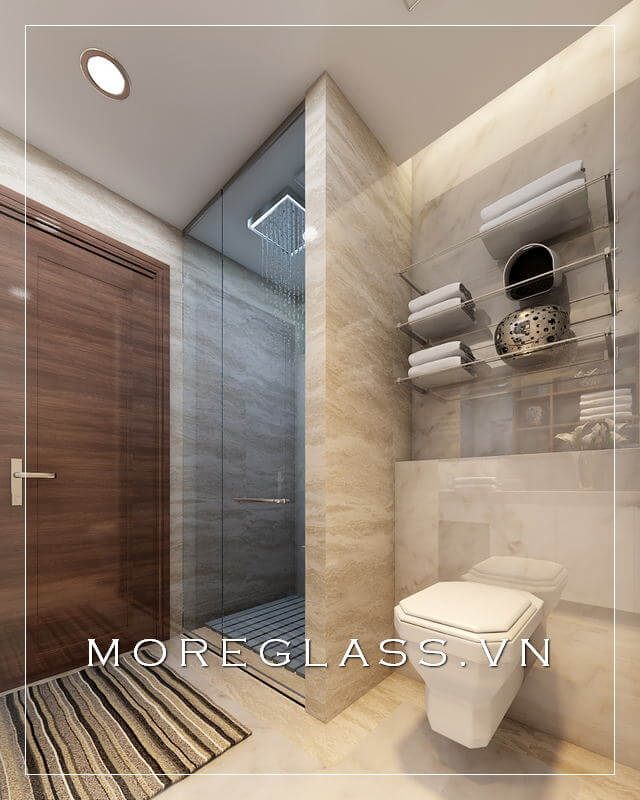 Vách kính cường lực là một sự tạo ra sáng tạo và ấn tượng của KTS, dùng để phân chia nhà tắm và WC.