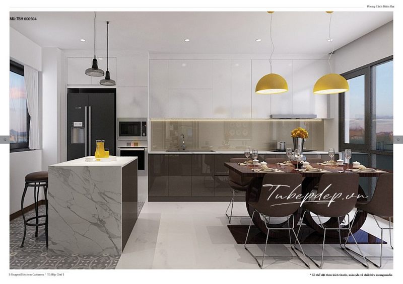 Để tạo nên phong cách hiện đại cho biệt thự, nhà phố, chung cư cao cấp, gợi ý thiết kế phòng bếp bao gồm tủ bếp acrylic xám bóng cùng bộ bàn ăn vàng, tạo nên sự kết hợp 2 tone cực hot trong những năm gần đây.