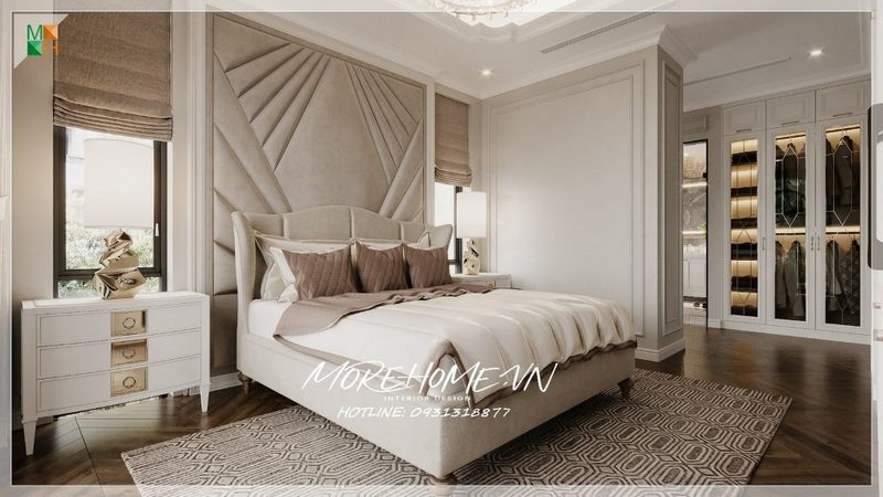 Thiết kế phòng ngủ liền phòng thay đồ, với phong cách đương đại màu trắng sang trọng, phù hợp với phòng ngủ có diện tích rộng như phòng ngủ master
